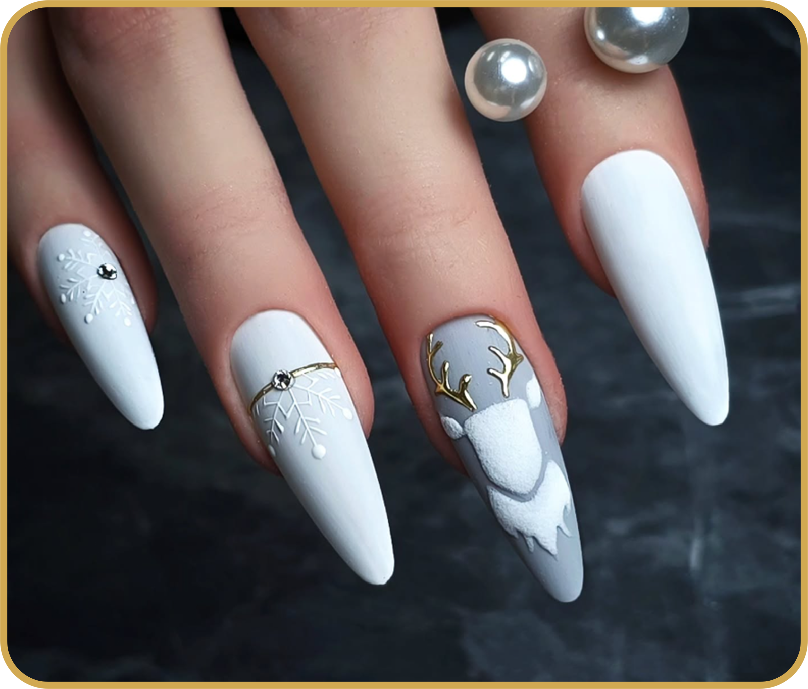 Domine 12 designs premium com paleta fria, metalizados, glitter, “sweater nails”, flocos de neve e linhas gráficas. Foque em camadas finas, selagem perfeita e visual de festa para fim de ano.